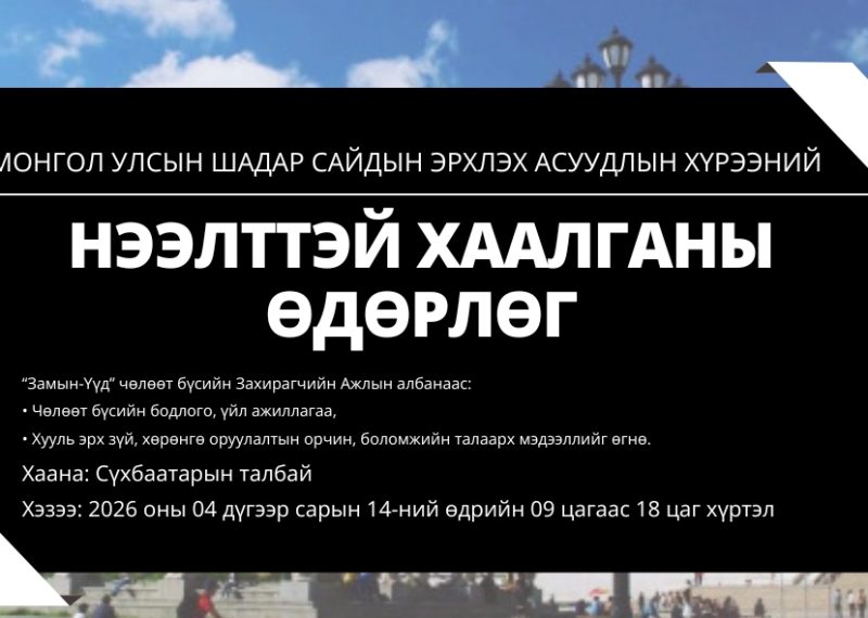 Монгол Улсын Шадар сайд Н.Номтойбаярын эрхлэх асуудлын хүрээний харьяа байгууллагуудын үйл ажиллагааг олон нийтэд танилцуулах, төрийн үйлчилгээг иргэдэд ойртуулах зорилгоор маргааш буюу 2026 оны 04 дүгээр сарын 14-ний өдөр Жанжин Д.Сүхбаатарын талбайд 09:00-18:00 цагийн хооронд “Нээлттэй хаалганы өдөрлөг” зохион байгуулагдана. Арга хэмжээнд Онцгой байдлын ерөнхий газар, Стандарт, хэмжил зүйн газар, “Бүсчилсэн хөгжлийн үндэсний хүрээлэн” УТҮГ,...